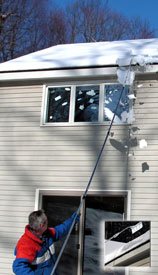 Prevent costly water damage to roof, ceiling and walls. No need to climb ladder. Our Snow roof rake clears snow from your roof fast. Easy to use, heavy duty, with a 14' handle three piece sections and 5 ¾" x 22" high density polycarbonate blade. **Aluminum roof rake shown in picture, the only difference is the pole. The steel rake is white**